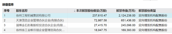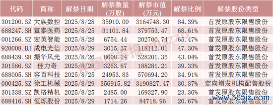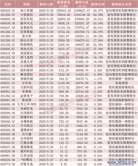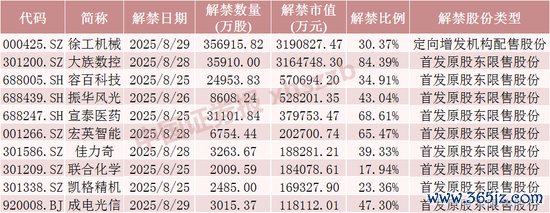 Wind数据显露,徐工机械8月29日将解禁35.69亿股,均为定向增发机构配售股份。富派别控8月28日将解禁3.59亿股,均为首发原推进限售股份。容百科技8月25日将解禁2.50亿股,均为首发原推进限售股份。
